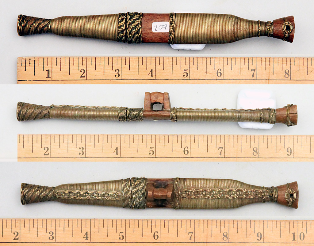 This small dagger of the Shona people (Zimbabwe and South Africa) is distinguished by the intricate woven brass wire decoration covering most of the wooden hilt and sheath. A wooden loop arises on one side near the mouth of the sheath. The double-edged blade is just over 4½ inches in length and shows the typical African mastery of cross section as what looks like a darkened fuller is really a concave tapering to one edge. Lew dated this example as being circa 1900 to 1920. Overall sheathed length is almost exactly 8 inches with a weight of 2.4 ounces.