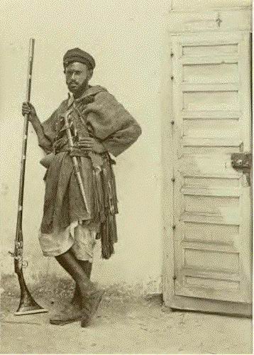 I would actually argue that the sboula hilt is much closer to a baselard than to a jambiya. As far as the origin of the weapon, the picture linked below of a soldier with a Moroccan musket seems to support a Maghrebi origin, and the Zanzibar attribution seems to be a mistake that has been perpetuated with little supporting evidence. Regards, Teodor http://vikingsword.com/vb/attachment...id=21170&stc=1 |