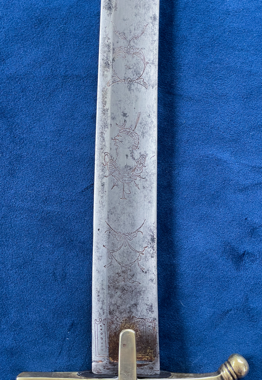 Attachment 229244 Attachment 229245 I’ve seen these motifs, plus the 'Turks head', the 'Charging Hussar' and more, in various styles on swords from multiple countries. I was under the impression that these were a general fashion statement rather than specific to a region. The physical evidence also suggests that Solingen blade makers were happy to supply blades that were fully decorated with whatever markings the customer wanted, including the clients' name (where the client could be a cutler such as Cassaignard, or a wholesaler like S&K or J J Runkel). The most compelling evidence for this are the blades imported by J J Runkel into the United Kingdom circa 1790 - 1808. I have four swords by different cutlers that use a Runkel-supplied blade, and each has the same generic decoration. All carry the GR cypher and the Royal Coat of Arms which must have been applied at the time the rest of the decorations were, meaning it happened prior to import. Attachment 229247 Coming back to the ‘Turks head,’ these and other cabalistic iconography (including a charging Hussar) also feature on the British 1788 Light cavalry trooper sabres that were made in Solingen and imported by J J Runkel at the end of the 18th Century: Attachment 229248 Attachment 229249 Attachment 229250 This French (possibly Dutch) Côtes de Melon style light cavalry officers' sabre also has a blade with a 'Turks head', yet was made in Solingen as evidenced by the 'Rose' on the spine. Attachment 229251 Attachment 229252 |