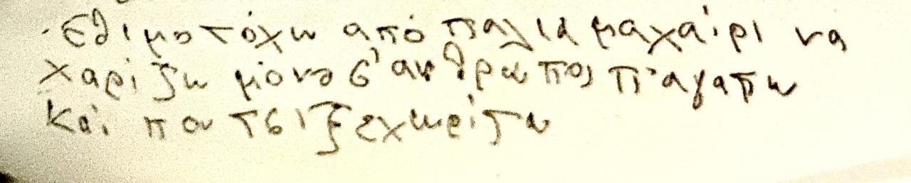 In Greek, it rhymes. In English: "It is an old tradition of mine to gift knives to people whom I appreciate and stand out". In Greek: Έθιμο το 'χω από παλιά μαχαίρι να χαρίζω σ' ανθρώπους που τους εκτιμώ και τους ξεχωρίζω. How to to pronounce: Éthimo to 'cho apó paliá machaíri na charízo s' anthrópous pou tous ektimó kai pou tous xechorízo. Many were made by an Armenian immigrant to Crete who made knives for over 60 years. I have one of his made in his latter years - not sure if he is still alive. last I read, his sons did not want to carry on the business. The knife maker trade there is pretty much extinct. Not many makers/shops left, tho there are a few. The 'Armenian' as he is know there, made the best ones. |