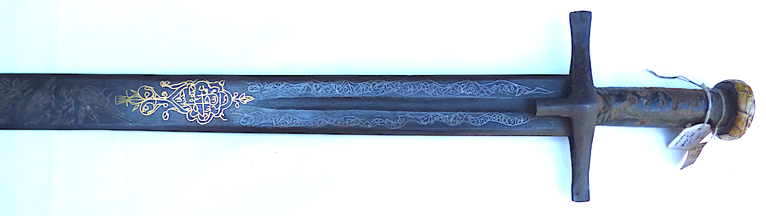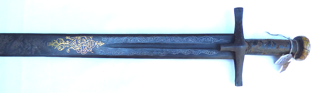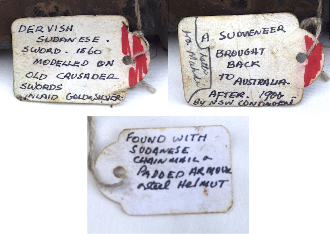 The new pictures and the tags are informative. The tag that says the sword was found with chain mail, etc. suggests that the sword was owned by a Sudanese knight and a Baqqara tribal calvary emir or unit commander. This group and their armour kit were influenced by western Sudan/Chadic military culture and mostly stationed in Omdurman during the Mahdiya. The tag notes that the sword was brought back "after 1900". This suggests that it could have been collected after the Battle of Omdurman in 1898 rather than during the NSW Contingent service in early 1885. Their service was against the Bega who did not use padded armour, steel helmets, etc. The attractive silver floral-type designs do not follow the style of Quranic texts common on Mahdiya swords. The gold cartouches are crudely made and translations could hold the keys to its origin. Cartouches are also not common, if applied at all, on Mahdiya era swords. Best regards, Ed |