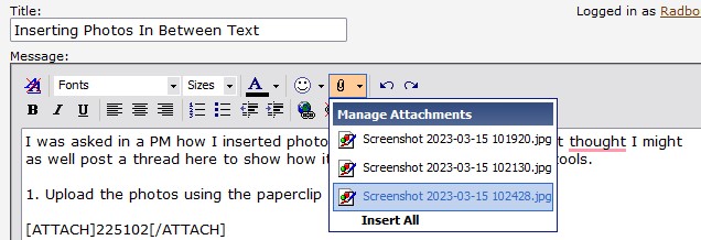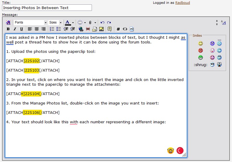 1. Upload the photos using the paperclip tool: Attachment 225102 Attachment 225103 2. In your text, click on where you want to insert the image and click on the little inverted triangle next to the paperclip to manage the attachments: Attachment 225104 3. From the Manage Photos list, double-click on the image you want to insert: Attachment 225106 4. Your text should look like this, with each number representing a different image: Attachment 225107 5. After editing your text, just 'Submit Thread' as usual. |