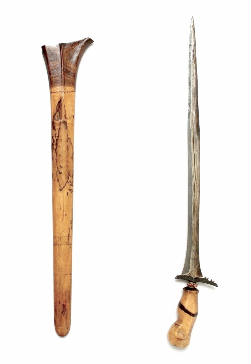 This is another mystery blade in my collection. I am thinking Indonesian or Malaysian. It is well made, with nice wood sheath and grips. The blade is not very sharp and has obviously been etched. Any opinions would be welcome.
