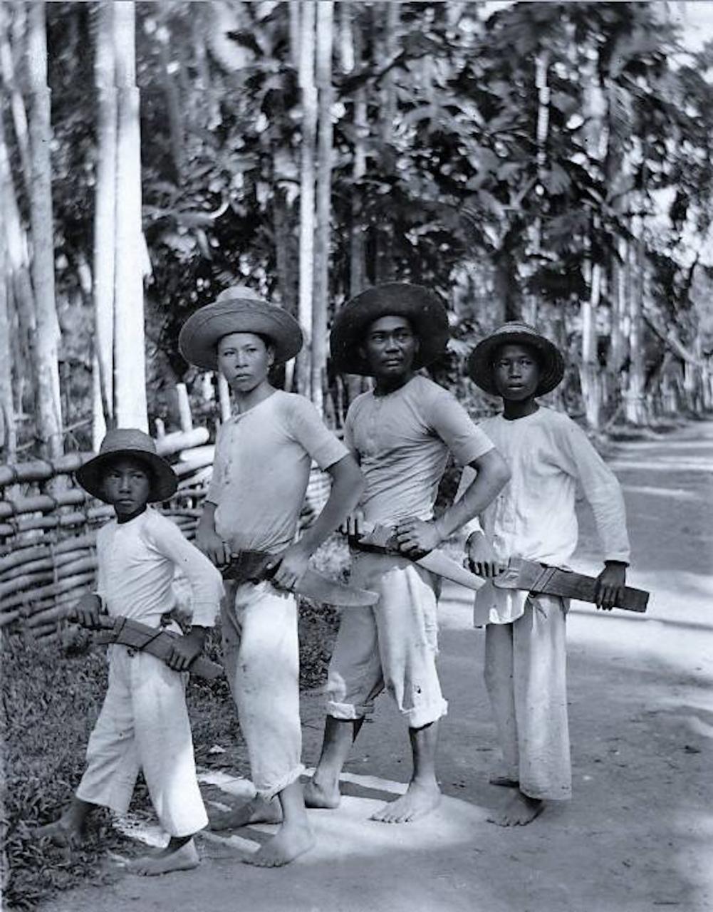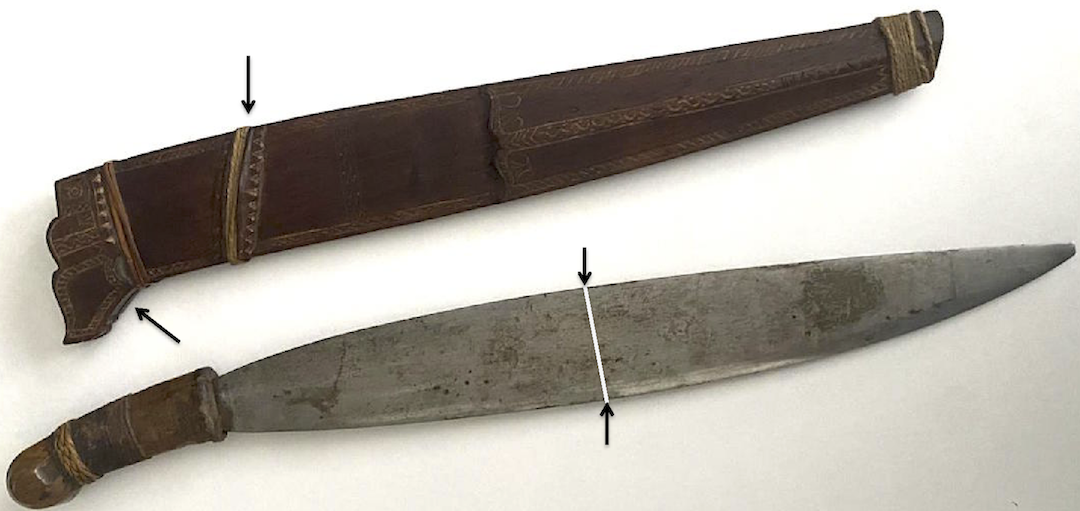 Interesting piece you have there. I took your picture and outlined where the maximum width of the blade occurs. It is actually on the hilt side of the blade rather than further towards the tip. A Palawano badung has a much more forward-weighted blade, with the maximum width closer to the tip than the hilt. Thus, this is not a Palawano badung IMHO. It is more in keeping with a Sulu blade that has been dressed in another fashion. In the following picture, I have shown the line of maximum width on your blade and also two arrowed features of your scabbard: one is the slanted area of attachment for a string belt; the other is a small "wing" to the throat of the scabbard on its bottom side. Attachment 227383 Now compare this arrangement with a Zamboanga bolo. There is the same slanted attachment for the belt and a similar wing on the scababrd. Also, the hilts are made from similar light-colored hardwood and are consistent with a Zamboanga origin. Attachment 227384 Here are some further pictures of that bolo, which is probably of WWII vintage. Attachment 227385 Attachment 227386 And here is an old picture of Chavacano men wearing these bolos. The similar scabbard styles to yours are readily apparent. Attachment 227387 To summarize, I think you have either a Sulu barung blade dressed in Chavacano fashion, or a bolo made and assembled in Zamboanga. |