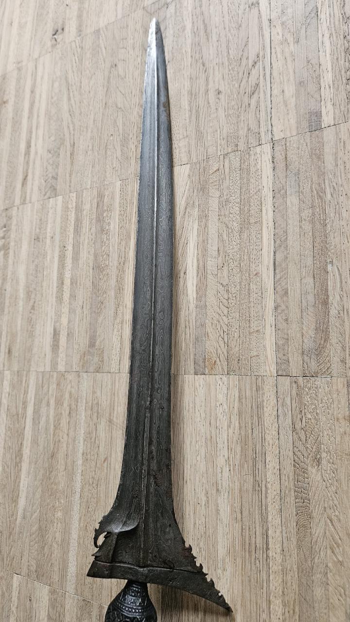 Dear forum members, this is one of my latest flea market finds, a rather nice, I presume, Palembang keris. I think a nice one, it's big, the blade is 43 cm (without peksi) and in total 55.5 cm, and, as far as I can judge, it still retains it's original polish and wash. It's smooth, razor sharp, and no signs of any later warangan treatments, otherwise the smoothness would have been lost. The seller told me it came from an Indonesian family who came to Holland in the early twenties.