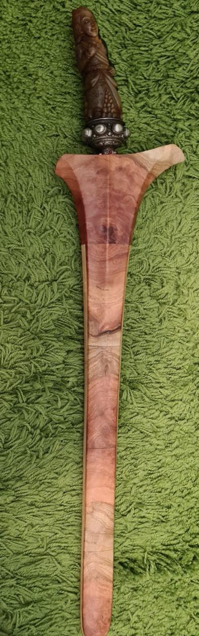 As other have said too, at least you were very lucky to get what appears to be a nice , old, blade. I see all too often blades that are simply cut out pieces of iron with a some painted motief with only the suggestion of a pamor. Your blade is forged and if properly treated will reveal some sort of pamor obtained in the forge and not with paint. As for redressing it , I have had some succes with a German dealer on Bali, he can find a sarong maker who can fashion a dress and a hilt for this kris. It is not easy but you neet to take accurate and extensive pictures of the kris with measurements, then , after some time, he will ship you the sarong. The hilt is not a problem. I have done this twice and the second time I was for a Bali Kris. The fitting was a little too tight but with the help of a local dealer(who is also a woodworker) with few minutes of work with a Dremel , the fitting is now perfect see how it came out here http://www.vikingsword.com/vb/showthread.php?t=29008 http://www.vikingsword.com/vb/attach...1&d=1688734529 http://www.vikingsword.com/vb/attach...1&d=1688734529 |