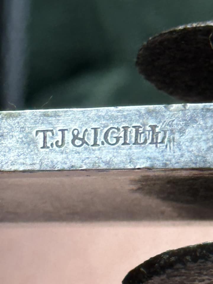 When Thomas Gill Snr died in 1801, the business was taken up by his three sons, Thomas Jnr, James and John. They operated in partnership until March 1802 when it was disolved. At this time the business continued to sell swords but it is not known if they produced new blades or simply sold pre-existing ones made under Thomas Snr. Below is an example of one such blade, and to my eye it looks like the original makers name has been over stamped: Attachment 236210 Of the three brothers; while they all intermittently sold swords, only John continued to produce sword blades until his death in February 1817, marking his blades I.Gill. This helps dates the production of that blade to between 1802 and 1816. |
