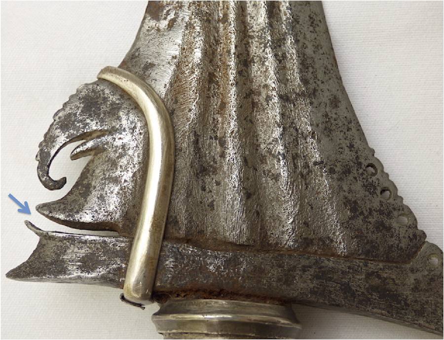 I don't know whether early Malay kris differed from early Moro kris. I suspect they were fairly similar, as it has been postulated that the Filipino kris may have given rise to the Malay kris. Nor do I know how early Moro kris differed from early Brunei kris. I'm calling this one a Moro kris, but it could be Malay or Brunei in origin. A central twist core flanked by hardened edges is typical of many early Moro kris that we have seen on these pages. The twist core could reflect a higher quality of sword, and a higher chance of it surviving to the present time, so I don't think we should be too carried away by the presence or absence of a twist core. I don't know how frequently twist core appears on Malay or Brunei kris, but I suspect the technique was not invented by Moro panday. There is one feature that I mentioned earlier that is unusual on this sword, and that is the gap below the elephant trunk area and the adjacent gangya, as indicated by the arrow in this picture. I have seen this before on very old Moro kris displayed in a Spanish Museum, but I am struggling to find the picture in our archives. I will post a copy of that picture when I find it again. My question to our experts is, have you seen this feature on Malay or Brunei kris, or any of their Indonesian keris relatives? |