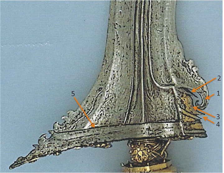 The following pictures are taken from "Traditional Weapons of the Indonesian Archipelago" by Albert van Zonneveld (Plate 169 and loose cover photograph). The keris is described as Bugis from South Sulawesi, with Javanese elements. Here is Albert's description of Plate 169: Note the provenanced date of acquisition in the mid-18th C and the likelihood that the keris was much older, perhaps dating from the mid-17th C. Albert notes that the sword dates from before the presence of Islam. Here are pictures of that magnificent keris and its scabbard: The important areas to note are numbered in the picture immediately above. The "elephant trunk" (1) that curves well down past the "mouth" (2). The recurved area with a clear bulge below the mouth that resembles a "leg and foot" to me (3). The gap (4) below the "foot' that separates it from the ganja (gangya). There is a well demarcated line of separation (5) between the ganja and the rest of the blade; this separation line is virtually straight, except at its left end where there is a very short down-turned section. When placed side by side, the two swords look quite similar in these areas. Yes, there are differences, and one could attribute these to cultural adaptations or choices, But there is enough similarity for me to argue that they are fairly close cousins with regard to the features shown. The original kris in this thread shows less artistic skill than the Sulawesi keris, but the former was likely designed for use as a weapon while the latter was purely decorative. From inspection of the Sulawesi keris, it is apparent that very early features of Bugis keris can be found in the Moro/Malay kris that is the subject of this thread. Since the Moro kris is often considered a pre-genitor of the Malay kris, and Mindanao kris are thought to pre-date kris in the Sulu Archipelago, it is plausible to think that kris developed by the Maranao, the Maguindanao, and perhaps the Iranum may have drawn inspiration from the Bugis in the earliest development of the Moro kris. It is interesting that the "bulge" below the mouth area persisted in Maranao kris construction up to at least the early 20th C, but is not seen in Maguindanao or Sulu kris of the late 19th–early 20th C (this point has been illustrated by Robert Cato in his book Moro Swords). Adaptation and change are to be expected over time. However, it is not unreasonable to think that some Mindanao tribal groups in pre-Islamic times took the Bugis keris model and adapted it to become a fighting sword instead of a dagger. One might expect that the oldest of these emerging sword weapons would have the closest resemblance to the Bugis model. All this is a lot of speculation, of course, and comprises plausible arguments based on supposition. The type of chatter that rattles around forums like this one. It's not really scientific evidence. A scientist would say that it is hypothesis-generating. Finding the evidence to support or refute such hypotheses is very difficult. One approach I've taken is to go through Artzi Yarom's old web site and look at his sold kris. I picked out those that resembled Maranao kris and those that did not. I then looked at indicators of age (length and width of blade, patination, etc.). Results will be posted on these pages when I finish looking at the pictorial evidence. |