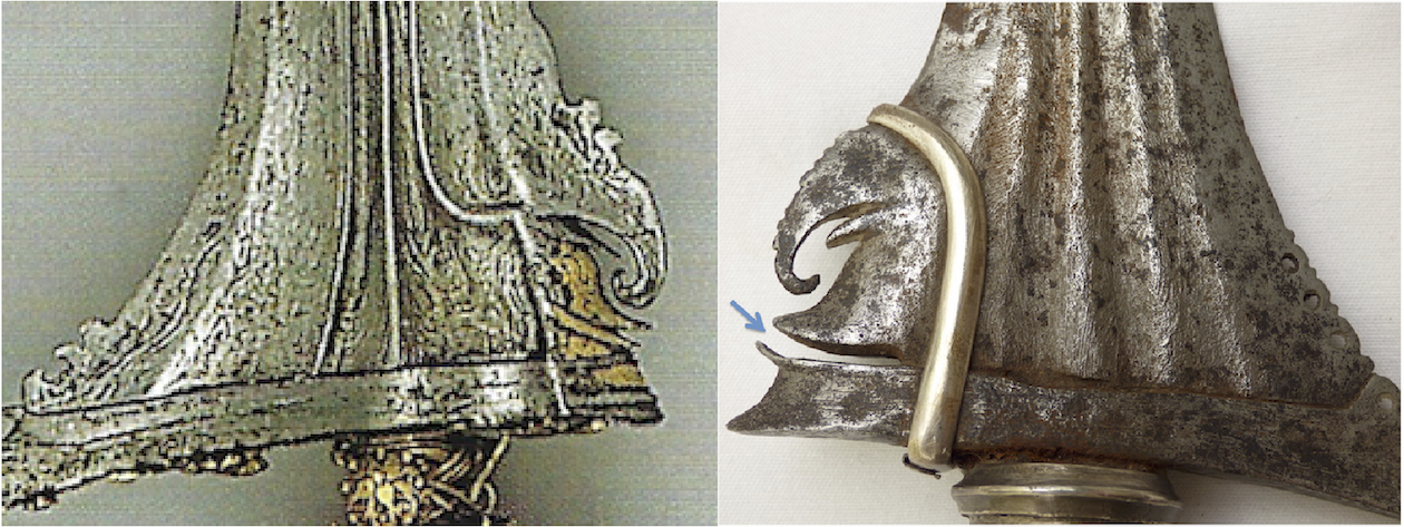 The point you raise about the drilled holes is a good one. The holes look fairly well defined, and show little effects of corrosion. In fact, when I X-rayed the area those holes looked very clean and circular--"punched out." For this reason, I think they are probably a much later addition. Lastly, the uptilted end of the gangya is seen on the very old Bugis keris example that I have referenced, suggesting that this style of gangya could have been copied from the Bugis at an early time in the development of the Moro kris. |
