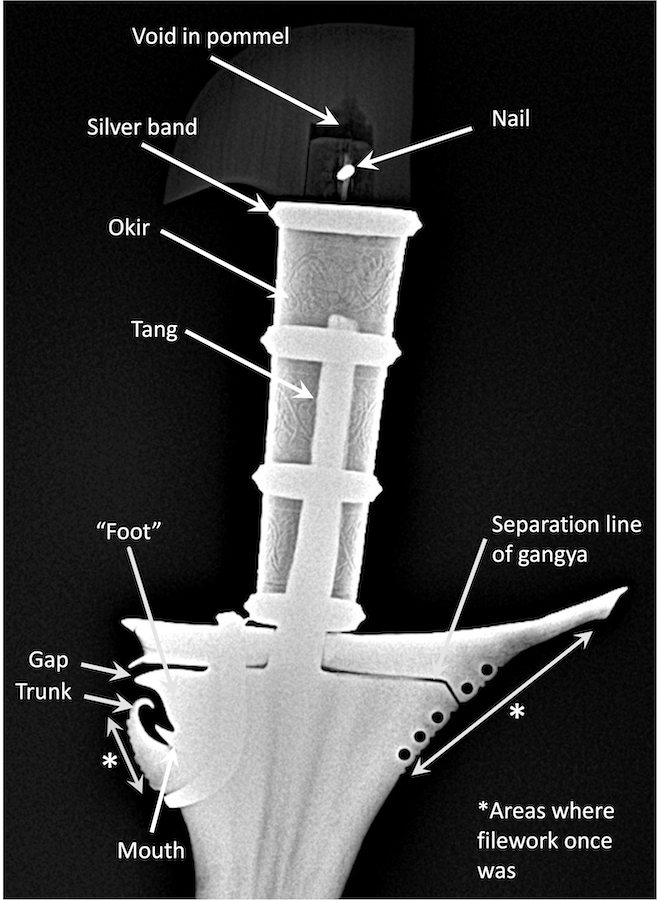 As promised, here are the X-rays of the hilt. The various features visible on the X-ray are shown in the picture below, which was taken mainly to visualize the tang. The tang seems quite long compared with 19th C and more modern kris, tapers slightly from the blade to the end of the tang, and has a slight bend. Also apparent are the thick silver bands spaced along the handle. Looking at the pommel, it is interesting to note a drilled void within it that has been hollowed out to accommodate a peg from the handle which has been fixed to the pommel with a small nail or pin. The pin is visible on the exterior of the hilt and there is a small crack in the wood caused by its presence. The degree of detail in this picture is more than I had expected, although we experimented somewhat to get the desired contrast in the image.