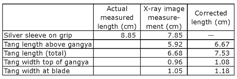 The following table shows how the actual length and width of the tang can be calculated from a print out of the attached picture. Using a vernier micrometer, I measured the actual length of the the silver grip on the sword; this was 8.85 cm. I then measured the length of the same structure on the image; that was 7.85 cm. This meant that all linear dimensions on that X-ray image needed to be corrected by a factor of 8.85/7.85 in order to arrive at the correct linear measurement. |