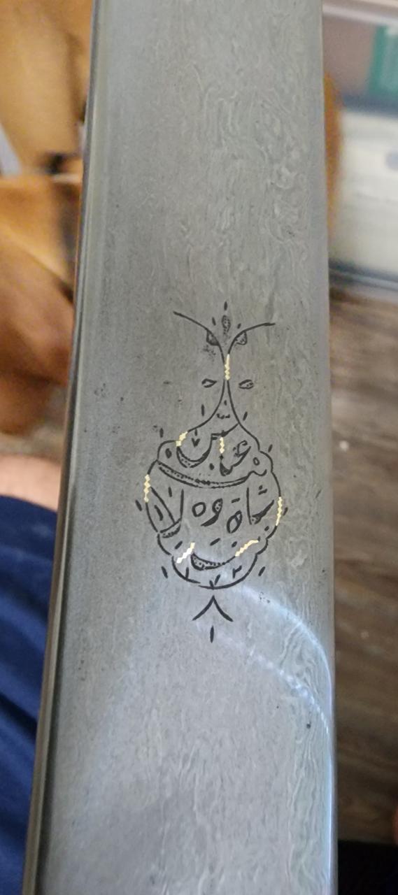 I picked up a nondescriptly named "curved sword" at an auction recently and may have done alright for myself despite my initial disappointment at the blade. From the auction photo I could see some form of calligraphy on the blade but not much else. The grip looks almost like one of the "modernized military Khyber knife" grips I've seen on some sabers from areas around and in Afghanistan. When I got the sword, there was no visible wootz, just some oddly twinkling crystalline dots amid the rust. The cartouche seemed promising though so I went ahead and cleaned a portion of the blade and did a minor test etch (please don't judge the etch I'm still figuring that part out hahaha). My progress so far showed most of my initial worries were unfounded. I'd love to hear y'all's thoughts. I'll post an update when I can manage a respectable etching. The cartouche has a "172" at the bottom of it. Assuming the rest of the inscription is fiction, I'm assuming that might point to a Gregorian 1759 manufacturing date for the blade?