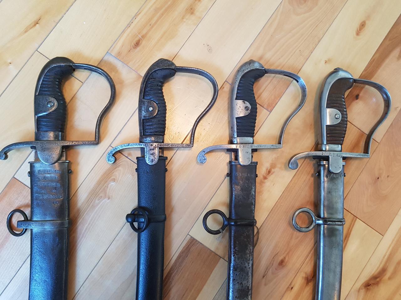 What do we know? The hilt is most certainly a late version from one of the blucher m1811 family. Late because, as Jim notes it has the narrow langets. This style of sabre was in service with the German Army from about 1848 to the beginning of WWII. It has also been used by other nations (it might still be in service as a dress sword). Of note is that there are no markings on the hilt. If it saw German service we would expect to see unit markings on the guard along the bottom of the langet. The number we see on the bottom of the knuckle bow is very close to the peen and on the original sword would have been hidden by the pommel cap. This points to it being a manufacturers number, later German swords like the IOD89 had individual parts numbered to keep them together during assembly or repair. Blucher sabres 1809 - 1945: Attachment 238210 Reichswehr ArtillerieSabel n/A 1914-1945: Attachment 238211 According to the article these photos are from, the main difference between the new artillerie sabre and the earlier ones is the removal of the hole for the sword knot sometime during WWI. As Jim has noted, the sword hole for the sword knot in this guard is smaller than the standard ones; this could indicate later production or service with another nation. The blade. This is an interesting one. I agree that my first instinct was also late 18th Cent based on the fullers running to the tip. But the full length narrow fuller also reminded me of the m1845. However now that we know that it is very short, 24 inch, (about 60cm?) I suspect it could have come from a hunting hanger, or a blade that has been cut down. I’d want better photos of the tip before making a call on that. Unfortunately, hunting hangers were civilian so came with a vast array of different blade types so this one could be anywhere from 18th Cent to late 19th Cent, we just can’t be certain without markings and better photos. The grip. This one is the deal breaker for me and marks this as a newer assembly, it’s too fresh for 19th Cent. There is considerable ‘patina’ on the blade and guard. With such neglect I would expect to see much darker wood with chips and cracks in it. None of that is present here. However it has been assembled with care and they have clearly been together for a long time, but we are now in the 2020’s even something assembled in the 1940s or 60s was 60-80 years ago, plenty of time for something to show signs of age. All that to remind us to remember to apply Occam's Razor to these situations, when presented with multiple assumptions, the simplest is most often the correct one. But while we are running thought experiments, I think this is a WWI era trench raiders knife / sword made from a broken French officers sword and a German hilt. |