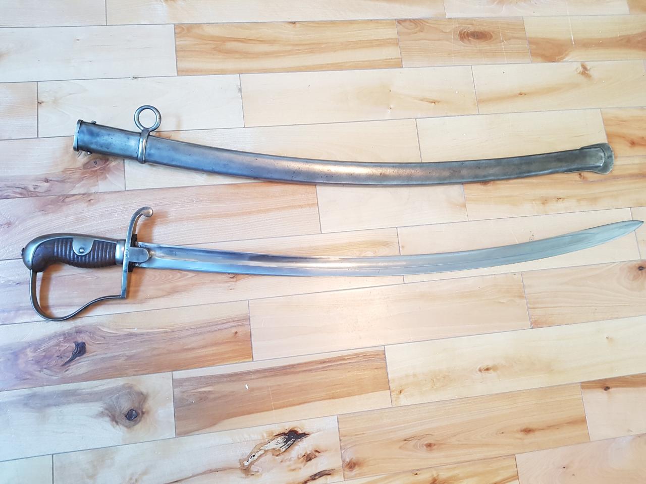 The hilt looks like it came from a German new model artillery sabre while the blade at first glance looks to be French in style, possibly mid 19th Cent. Without markings and blade diamensions it's difficult to be sure, but it looks similar to the types of blades seen on the French m1845 infantry officers sword. See if you can see any reminants of engraving on the spine of the blade close to the hilt. The hilt is missing the backstrap, grip tabs and pommel cap that would have gone with that guard and the wood grips are modern replacements. Looking at how the blade is attached to the hilt, and given the likely newer age of the parts, I would judge this to be a more recent marriage of parts, than a colonial era eratz sword. |