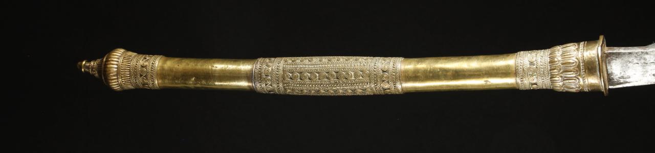 __________________________________________________ __________ The smaller one was sold as Vietnamese but I suspect that it is Birmese given the relatively short grip and the presence of a fuller on the blade. But that is just a best guess based on very limited data. Some stats, for those of you who like that sort of thing: 77cm total out of the scabbard. Sword 472 grams. Scabbard 130 grams. 24cm grip. Tapers slightly from 25mm near the blade to 22mm near the end. 53 cm blade with a very shallow fuller. Spine transitions from flat to triangular about 24cm from the base of the blade (but no false edge). Profile tapers very slightly from 22mm to 21mm and then swells slightly to 24mm at the cutting portion of the blade. Distal taper from 7.5 mm at the base to 3mm at the end of the fuller and 2 mm just before the tip. Maximum curvature 30mm measured by taking the distance beween the blade spine and a straight line from the back side of the tip of the blade to the back end of the pommel. POB 6.5cm from the base. Silver fittings on the grip and scabbard. Red velvety or felt cloth on the scabbard mouth. The scabbard is a reddish wood and tapers distally from 28mm at the mouth to 12mm at the tip. Some loose strands of silver wire at intervals around the scabbard. Not sure if the grip is bone or ivory, though I'm guessing the former. The blade is a bit worn but the construction is solid. __________________________________________________ __________ The longer one was sold as a Hmong / Laotian Montagnard dha. Blade is laminated. No scabbard for this one. Hollow grip, maybe bamboo? Nice copper or brass wirework with swirls and mesh on the grip with a miniature "tsuba" (I don't know the local term). Stats: 113cm total. 557 grams. 65cm grip including the tsuba, which is .5cm. Grip is approximately round and 23mm thick on the wooden part, 26mm on the wire grip part. Tsuba is 43mm wide along the blade and 34mm along the orthogonal axis. 48cm blade. Blade profile starts at 21mm, then tapers to 19mm and then swells to 25mm. Distal taper from 9mm at the base to 1.5mm just before the tip. Maximum curvature 50mm measured by taking the distance beween the blade spine and a straight line from the back side of the tip of the blade to the back end of the pommel. POB is exactly on the tsuba. Very interesting sword (almost a polearm, but due to the overall size it still feels more like a sword). __________________________________________________ __________ Both are quite sharp. More pictures to follow in my next two posts on this thread. I'd love to know more about these two swords in particular and south east Asian swords in general, so any insight or background information you have, or any references you could recommend would be greatly appreciated. I found the following threads on Montagnard dha useful so I'll link them here: Montagnard Dha tribal association? Montagnard Dha Sources Hoping For Some Help Identifying the Origins of this SE Asian Highlands Weapon what is it? Montagnard Daab, Dha |