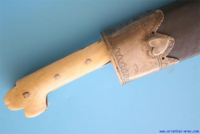 GP, congratulations on your new yataghan. I have what I believe is a similar yataghan, except mine has lost the original leather on the scabbard and has been shortened. The scabbard has a very similar pattern carved on it and ends similarly in a thimble at the chape. Based on the scabbard and the thimble, I used to think it was Algerian, but now I am not so sure. When I showed mine to some yataghan collectors in Bulgaria they thought that it was from Macedonia or Northern Greece, at least based on the hilt and bolster.