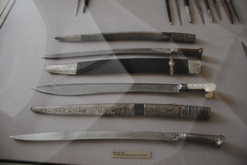There are numerous examples of blades with rows of Turkish ribbon in this forum, on the internet, in museums and published in books. They are far too many to even attempt to list here. Then there are also numerous early Ottoman pattern welded barrels on firearms. Interestingly enough, pattern welded blades also exist in Balkan folklore as for example "сабя диплянка" (sabya diplyanka), which in Bulgarian means "saber with folds" or "ribbon saber". This is different from сабя дамаскиня (sabya damaskinya), or Damascus sword, which would refer to one made of wootz. I believe there is a song about Krali Marko, a popular hero throughout the Balkans, and his fight with Musa Kesedzija, in which Marko shatters Musa's damaskinya with his diplyanka. Here is an excerpt from a Bulgarian folk song about St. George fighting a "ламя" (lamya), which is a 3-headed Hydra like creature, which references pattern welded sabers twice: че си зема сабя диплянка, (and he took his diplyanka) сабя диплянка с дванайсет дипли (saber with twelve ribbons) Разсърди се свети Георги, (St. George got angry) че си извади сабя диплянка, (he pulled out his diplyanka saber) че й пресече дор три глави, (and cut off all her three heads) It is fairly obvious that the song is referencing a blade with rows of Turkish ribbon, especially in the part that goes into details such as the number of layers, in this case 12. The presence of such blades into folk songs would suggest that they were valued and predate the late 19th century. GP's question on blade form is a good one. The examples with a widening toward the tip look similar to the machairas and falcattas of antiquity, and probably handle similarly. I am not a practitioner of HEMA, Kali or any other martial arts, so maybe someone with such a background can comment more on this. An alternative explanation may have to do with these earlier yataghans being derived from Balkan utility knives, such as the shepherds' knives in Bulgaria, which are shorter and wider compared to the longer and more elegant blades into which yataghans ultimately evolved. Here are some more examples. The first one is from the Bavarian Army Museum in Ingolstadt. It is interesting to see the rings on the scabbard for a baldric: Attachment 241813 Then there is one published in the recent Gold and Damascus catalogue, # 75, with a long 80 cm blade and nine layers of twistcore: Attachment 241814 Attachment 241815 |
