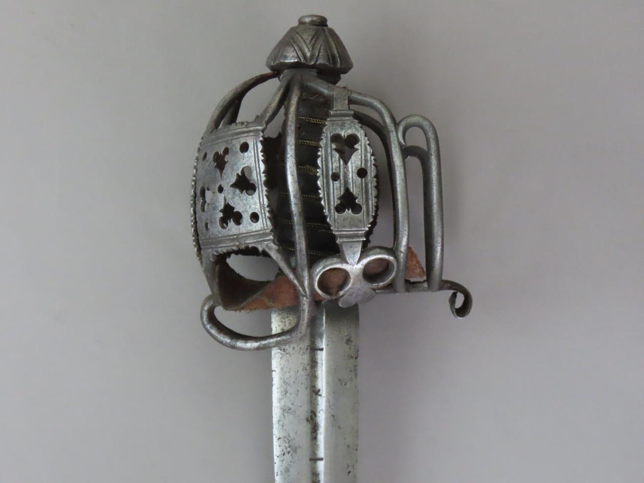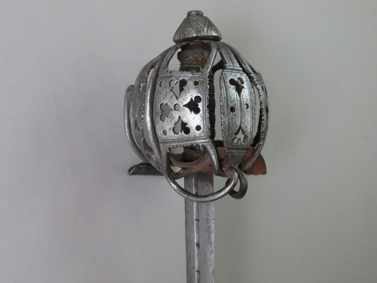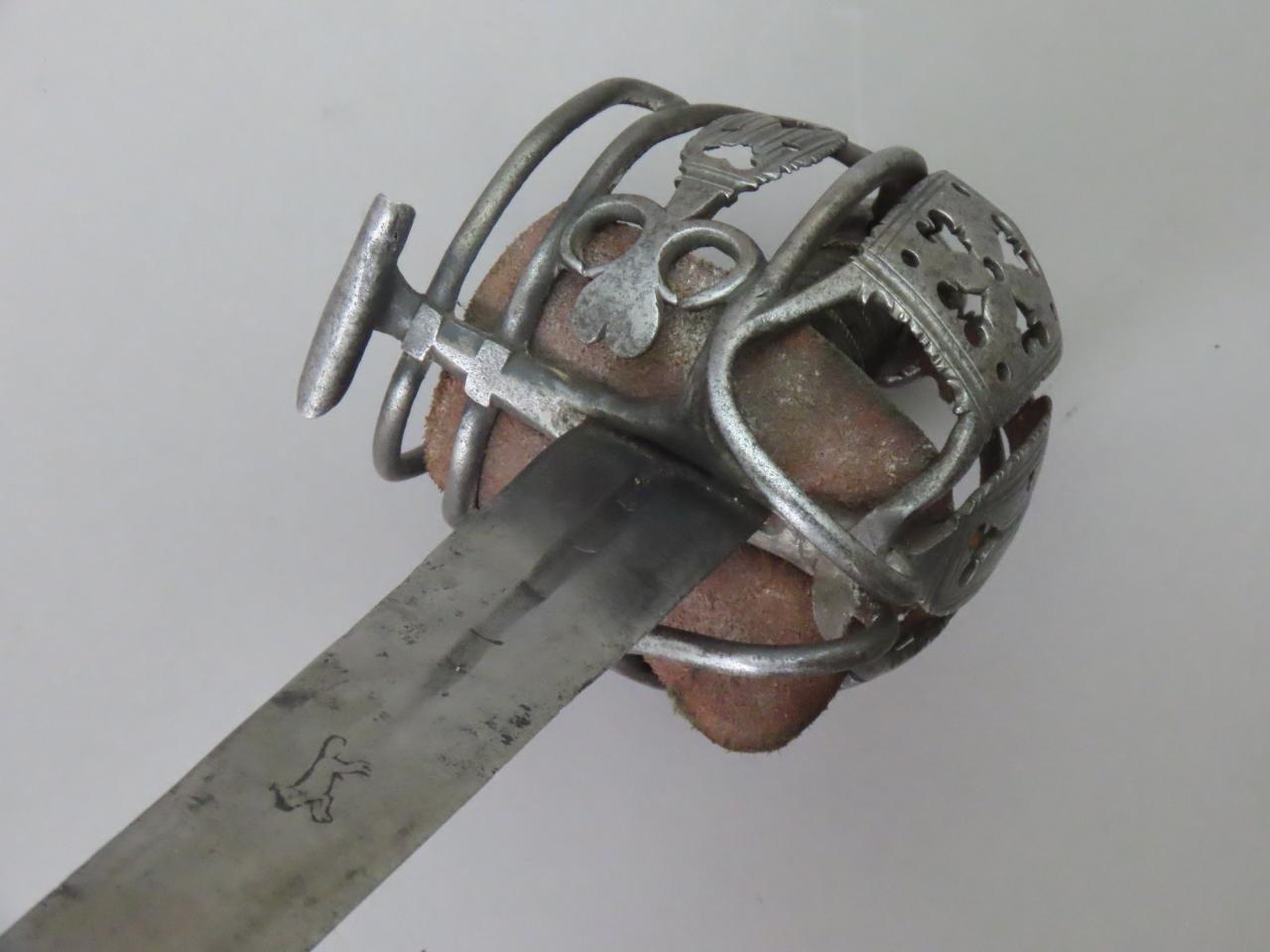 In the many years of 'trying' to understand the distinctive Highland basket hilts(I think I have just scratched the surface) it seems that this form with the pierced designs in the shields are collectively regarded as 'Glasgow' in form. If I understand correctly the Stirling hilt designs were more 'free form' and quite 'artistic' in the ironwork which decorated the 'basket'. Contrary to many notions...the 'S' often seen in many hilt designs was not the letter to supposedly signify STIRLING or SCOTLAND (of course) but simply a connecting element in the guard assembly. The use of older blades in Scottish basket hilts was of course common, and like many instances with specific traditional weapon forms, it was not unusual to remount heirloom blades which remained in clan families for generations. At Culloden (1746) it was exclaimed that from the field of battle, only 197 broadswords were retrieved, which is incredible considering there were nearly 5000 Jacobites fighting. The men fighting were of course close family members, and as they left the field, I believe they would have taken these proud swords from those who had fallen. This was poignantly a good move, as of those swords retrieved by the Hanoverian forces, most ended up being deliberately disgraced by the blades taken from the dismounted swords and made into a fence. :( I agree with Jose on this basket, in which the highly decorated shields had developed more by c. 1740s onward. After Culloden of course the general production declined and the artisans in garrison towns such as Glasgow, Stirling and others made baskets for the military units of the British army swords. Actually the basket hilt was preferred for cavalry through much of the 18th century. The extended guard protruding from the basket according to Whitelaw, began to be added to hilts at the end of the 17th century, and was noted to protect the hand from the 'wrist cut' which was a feature in Scottish sword play. In many cases these were welded on to existing hilts. In the 'British' versions of the Scottish style basket hilts, again typically for dragoons (cavalry) there was a curious oval aperture which has been determined to allow the horseman to hold his reins while discharging pistol. These were thought to have been a feature more of 1770s but it is now known they were in use much earlier in the century. Also note, the ring under the pommel is a distinctly British feature well known on many dragoon sword forms of c. 1750s onward. On the Scottish hilt, the saltires are slotted into pommel. This is of course 'rule of thumb' but notable nonetheless. One of these 'Glasgow' style British hilts with 'horsemans aperture'is shown in second photos, and recent research has found these were actually known as early as 1740s-50s. The first illustrated is earler 'Glasgow' form, with added on wrist guard, the blade is Wirsberg (by mark) c. 1630s, the hilt presumed c. 1700-10. TO THE BASKET HILT OF OP This is an amazing example of a true Glasgow hilt of the Highlands, and I think more likely to have been in use in its incarnation for the '45, the blade however might of course seen any number of the earlier Jacobite events even prior to the '15. Most remarkable is the SHOTLEY fox on the blade!!! as this marking is relatively rare on Highland weapons, that is, that have survived. It is important to note that the Jacobites were not always Catholic, and many Scots fighting for the cause had various other perspectives, and were of other Faiths. |