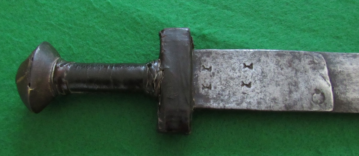 I remember seeing blade stamps like these (see photos 2 & 3) but I can’t remember if I saw them on khodmi or takouba. As shown, my blade is stamped on both sides but the stamp location is staggered with the stamps on one side being closer to the guard than on the other. Can anyone tell me which weapon these type of stamps appear on (or are they found on both)? When I first saw this sword, I wasn’t going to buy it because I thought that some ignorant sod had drilled display hanging holes in the blade but then I asked myself, “why three holes?”. If the sword were to be hung vertically, one hole would be enough and two would be enough for horizontal display. I concluded that the holes were probably drilled either by the maker or the owner. My second question is whether or not the holes were likely to have been filled with copper or brass. The blade on my sword measures about 29.25” (74.295cm). Although the fuller is offset, the blade is double edged. The leather on the cross guard has a stamped border. There is a short half cylinder of leather with an incised design, on the hilt just behind the guard. The large oval pommel is iron and measures 2.5 x 3 inches (6.35 x 7.62 cm). The base of the pyramid atop the pommel is also iron and has an incised design. The remaining four parts of the pyramid are made of alternating layers of incised brass and copper. The tang is peened over a brass button capping the pyramid. The ornate pommel clearly shows that this blade was meant to be a cut above average (pun shamelessly intended). There is a pierced and incised brass (four corners of the desert” design just below the sheath throat. Unfortunately, most of the sheath suspension is missing. Most unfortunately, the chape is missing also. Sincerely, RobT |