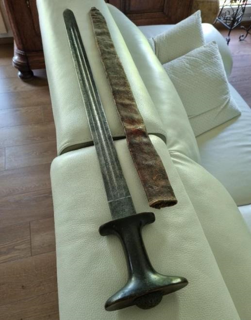Shotel: https://www.vikingsword.com/vb/attac...1&d=1586181619 https://vikingsword.com/vb/attachmen...1&d=1195309821 https://vikingsword.com/vb/attachmen...1&d=1195477794 Gurade: https://www.vikingsword.com/vb/attac...1&d=1159994261 https://www.vikingsword.com/vb/attac...1&d=1469009018 And of course the Afar gile/jile: https://www.vikingsword.com/vb/attac...1&d=1160536688 That's my understanding of it anyway, but others may know more. With respect to the hilt materials, while I have not been able to confirm this, I've read at least one source that claimed the light colored, yellowish hilts were made of giraffe hoof, whereas the darker horn may be either rhino or bovine. But then again, buffalo/cow horn comes in different shades so perhaps the giraffe hoof is just a bit of fanciful advertising. Both pieces of your grip look like horn to me, rather than wood. |