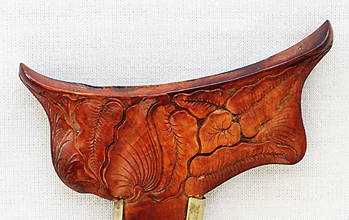 That green tinge is bad color balancing BTW. Part of why i apologized for my picture quality. :) The horn on the sandang walikat is green horn, but the color isn't quite that green. Hey, maybe they all need a bath. :D Alan is right, of course. There are lots of small subtle differences which seperate these sheaths as specific variations on a form. As for the name game, i tend to agree with Alan, though i guess it helps to at least have names for the general form types. In that sense i would guess that my first two examples are ladrang forms (formal), the bone horse head patrem is also a ladrang form, the ivory patrem is gayaman and the horn sheath is obviously sandang. The problem with this though is that i have no idea which of these catagories some of Alan's pieces would fall into. Would the sheath with the bird w/the floral design in the center be a formal dress sheath. What about the one with the horse that is basically the same shape. To me the lion sheaths that are known to be connnected with keris taken home by Dutch soldiers appear to be based on a gayaman form. Do these sheath always have the Dutch soldier connection or were some made for indigenous consumption? |