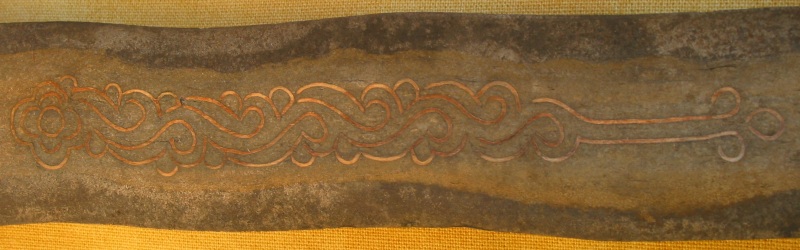 On your Luma the vegetative vine motif usually represent the creative forces. The end looks like a rounded version of the old trident symbol. Probably it's then Shiva's trident from the old beliefs still existing within Folk Islam? If so one mening of the inlay could be that it's directing strong metaphysical forces towards the direction of the point (=opponent)? An alternative meaning I have heard is that some people think it's a Naga and the end is a tongue? Michael |