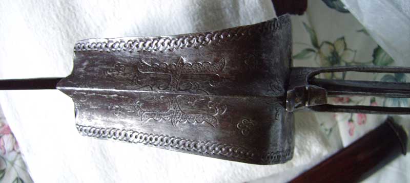 A very nice peudeueng peusangan with a hulu meu apet ( pedang type 1). I believe the pattern you talk about is just a vegetative motif. If is seen on many hulu meu apet, I will try to post some more pictures soon of some. The floral motifs seen in Aceh are very common on weapons. Geometric and vegetative motifs are often symetrical. And very often enclosed in lines or borders. While it would be an H in the latin alphabet I am pretty sure they mostly use the arabic alphabet there. I hope someone here can add more on this Maybe Utami will see this soon he is our man on the ground so to speak on these swords. Or Albert he certainly will have some good input on it. |