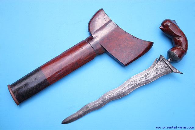 Sheath form, looks like a Bugis Chieftain, but blade does not qualify as one. The second piece, I'm very familiar. It's in my possesion.. The blade although looks thick, the entire ensemble is small. (( see here for more details )) .