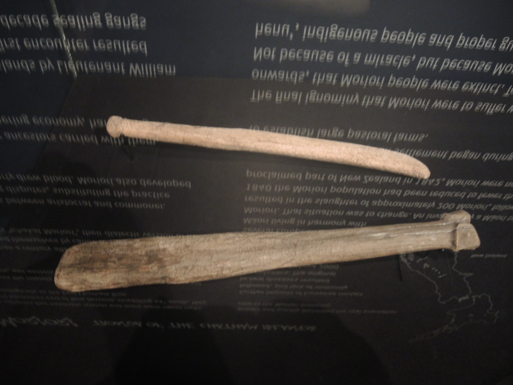 THERE ARE TWO WHALEBONE WEAPONS IN THE DISPLAY THE SHORT TAIHITA AND THE LONGER MORE OBVIOUS BONE WEAPON. THIS DISPLAY HAS ALL THE DIFFERENT FORMS OF MAORI LONG WEAPONS AT THE TOP PORTION AND THE SHORT FORMS AT THE BOTTOM. THE MUSEUM IN CHRISTCHURCH IS QUITE GOOD AND THE DISPLAYS WELL PLANNED AND LAID OUT WITH GOOD INFORMATION. THE PICTURES WITH THE BLACK BACKGROUNDS ARE TOOLS OF THE MORIORI TRIBE WHO LIVED ON AN ISLAND AND WERE NOT WARLIKE LIKE THE OTHER TRIBES. THEY SUFFERED GREATLY THRU OUT THEIR HISTORY BUT SOME HAVE SURVIVED. MOST OF THE ITEMS ARE MADE OF WHALEBONE. IT WAS INTERESTING AS I HAD NEVER HEARD OF THEM.