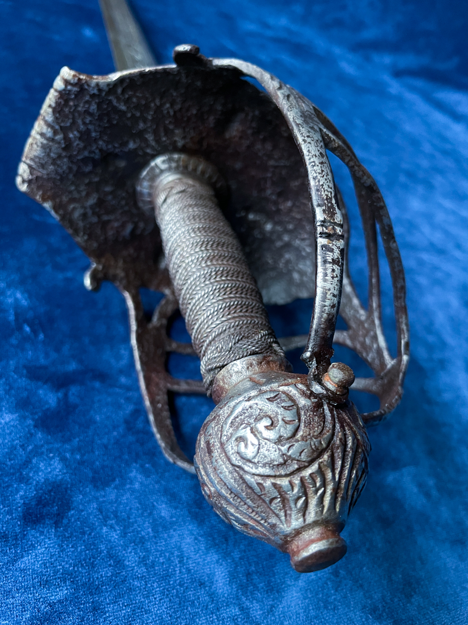 I'm guessing that the grip wire was redone at some point, possibly in the 1800s? Although the Turkshead knot looks good so it might be older but that seems unlikely. All in all an interesting piece, even with the peculiar 'panel' on the blade. Will need to keep an eye open for similar blade profiles to compare. |