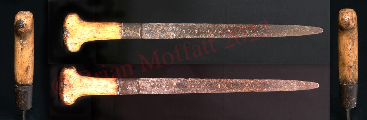 I was watching Kidnapped last night, admiring the dirks and remembered this example dated 1785 on the hard leather sheath. Overall sheathed length 46.3 cm with a 33.3 cm blade that becomes double-edged for the last 45%. Maybe a very rubbed crown and G on the blade versus overinterpreted corrosion.