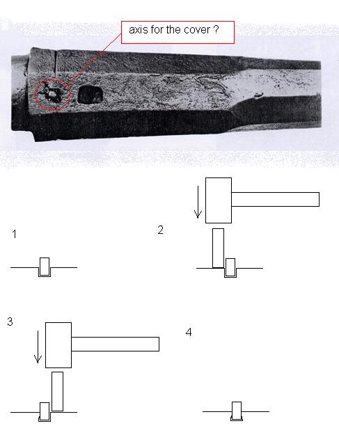 This is not an axis for a missing touch hole cover but a nail to fix the stick stock to the iron socket.