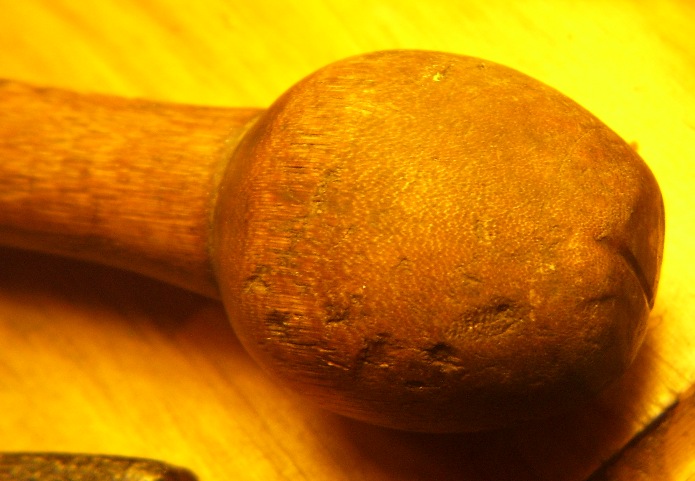 ,another recent acquistion....bought cheaply, thought originally by the seller to be wood. But after receiving it realised it was better than that...a hot pin test on shaft / ball confirmed the smell of 'burning hair' ....keratin Magnifying glass confirmed tubular grain at either end. Feels very 'grippy' .... even with a 'wetted' hand .....Rhino ??Carved crosshatching to handle end ...with a 'lanyard' hole bored using some sort of 'primative' drill, definately not by a modern drill. Old patina, OAL 22" ......is this considered a knobkerrie ?, Rhino horn for a drum stick seems to be a bit extravagent. Be very interested in other forumite's views, thank you Kind Regards David . |