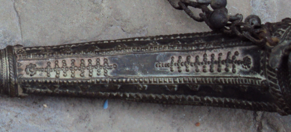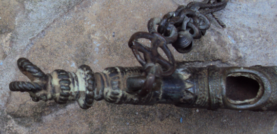 Horn/bugle, There are in "Stone" so should be okay here. Found this today in a place I have visited almost every month or two for years that has never yielded anything, then today bang! To me it seems to be from the North Nigeria and westward, Mali and so on. Need not be that old, Sokoto and other cities did not fall to the British until 1903. The decoration is rather reminiscent of textiles and leather work from the region. 42cm long in a straight line end to end. Note the circle link in the chain with a cross in the centre. Look at this link,
