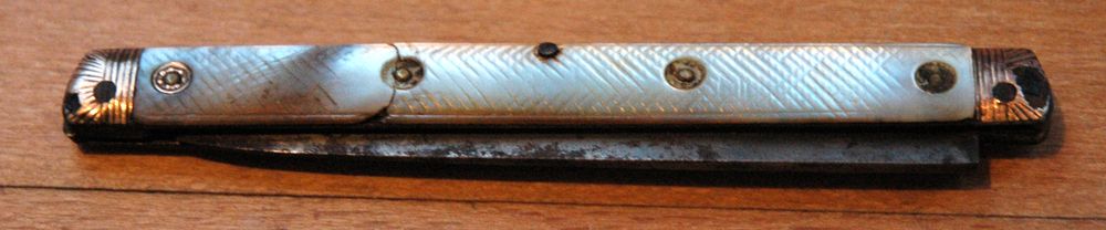 I recently dug up an old pocketknife on a flea market. It clearly had a long life... It sports a mother of pearl handle / metal (gold?) bolsters. I guess it is French, but you input is welcome... cheers Tim - Last edited by fernando; 12th April 2011 at 06:49 PM. Reason: Picture restoring. |