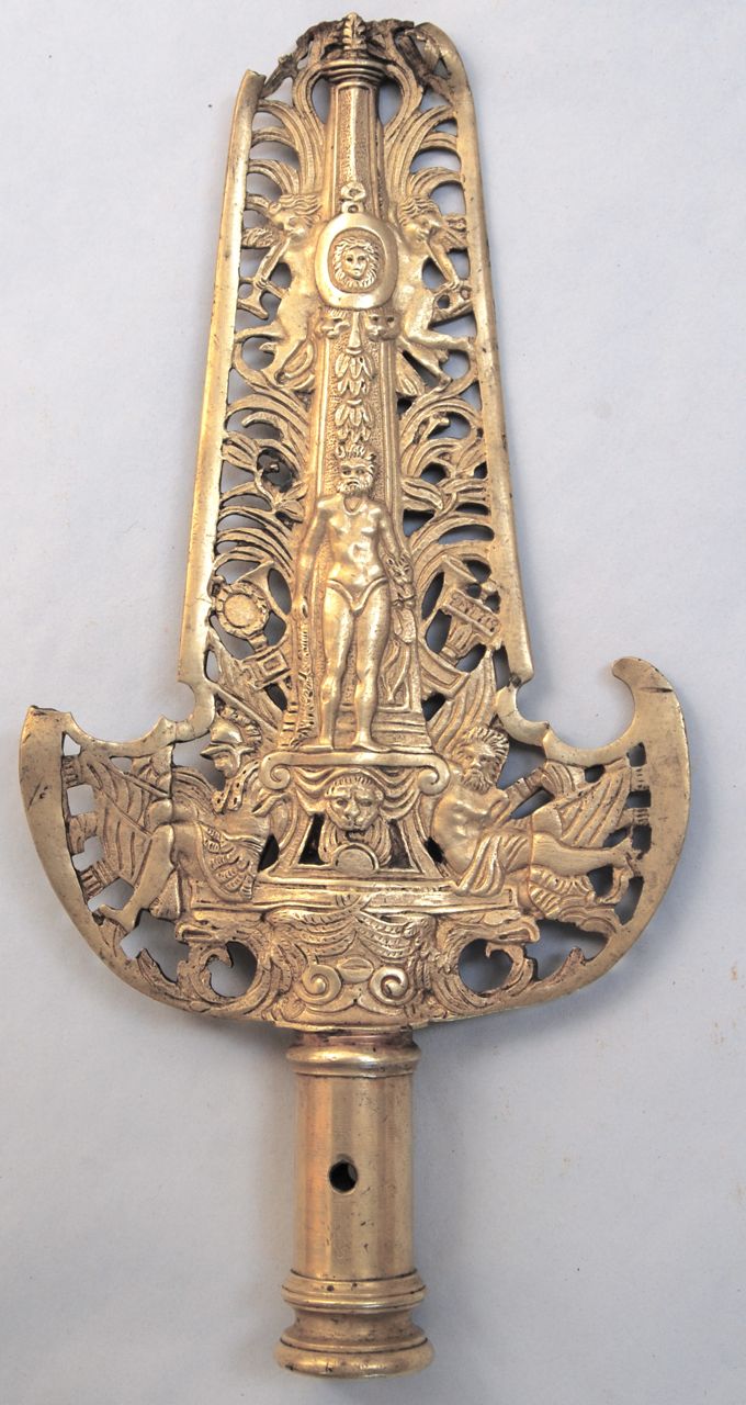 It appears to been made for ceremonial purposes, and is cast in solid brass. Also it's damaged - looks as if it's been thrust into a fire and bent off at the tip. I did notice a similar looking piece in Rembrandt's painting; the Nightwatch, which has the Lieutenant holding a type of staff - not an exact likeness. Any ideas of it's age or purpose and what would you describe it as? Regards, David |
