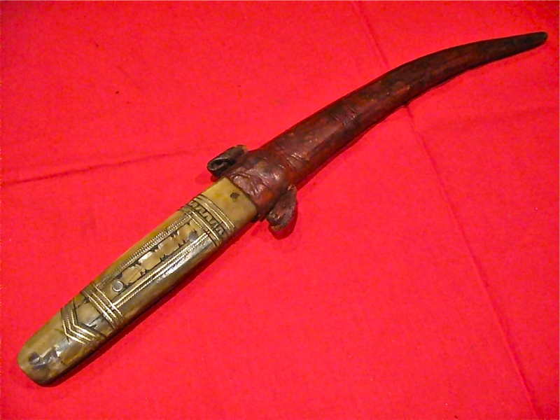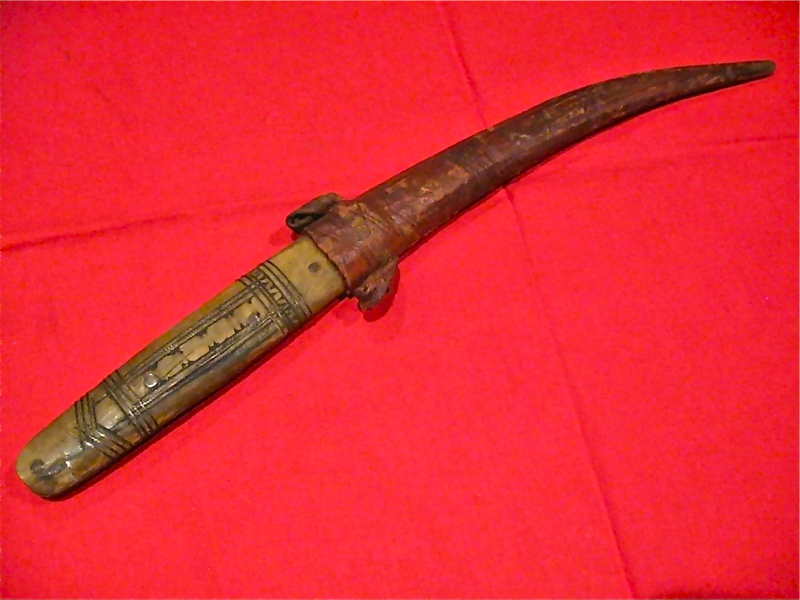 let me introduce you my last "friend" "Shula" early 1920's dagger single-edged curved-blade from Moroccan Berber tribes grip made from a light colored aries horn with inlaid twisted brass wire decor well forged blade and nicely fullered up-curving blade 22 cm (± 9 inches), back edge, nicely engraved with geometric design scabbard covered with tooled red leather in fairly good condition "Shula" total length 37 cm (± 14 inches) - blade only 22,50 cm (± 9 inches) now, it will joint to his "big brother" all comments, information complement are welcomed, thanks per anticipation 2 groups for pics - condition as I received it - how it's looks now à + Dom |