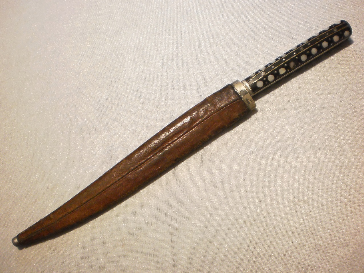 I also got this beautiful Bichaq. Because of the fuller work I think it was made around 1900 in the region of Trabzon, maybe in Surmene. The handle is made of black horn with mother-of-pearl inlays. The metal mountings are of nickel silver and the scabbard is covered with goat leather. There is an inscription on the back of the hilt, it would be great if someone can translate it Total length: 31.5cm Without scabbard: 31.4cm (really )Blade: 20.5cm Best Robin |