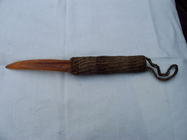 I don't remember seeing anything like this posted before so I thought I'd post this piece for comments. Bone blade is 5-3/4 inches long and 1 inch wide at its widest point. Hilt is 5-1/2 inches long and is 1-1/2 inches in diameter and covered with a knotted netting (I'm not sure what the netting is made from). Underneath the netting is what looks like bundled reeds. There is a woven loop on the end of the hilt for either hanging or maybe to go around your wrist to help keep you from losing it if dropped. I have absolutely no idea of who or where this was made. It does seem to have some good age to. As usual all comments are welcome.