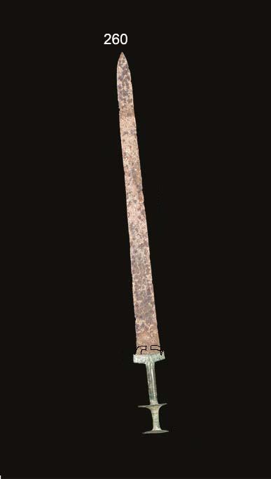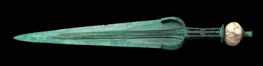 Most of the examples that I've seen on various sites while trying to research mine (with hilt elements that curl down onto the blade) are 'all bronze'. The Iron and bronze types are all much less common. You might not find something 'exactly' the same. Have a look at this one: http://www.primigenius.com/shop/inde...iscell&id=2831 And attached a picture of a bronze one sold by Christies: |