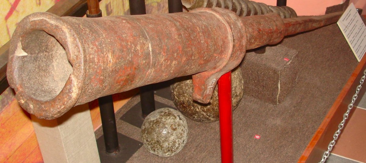 The overall length of this huge and heavy all-iron tiller gone is 1.92 m, the monstrous bore 10.5 cm, denoting that it was not a portable but strictly stationary piece. Its rear grip end is shaped like the hilt of a knife and laterally punched with a series of decorative cross-shaped elements. The hook is rather short and blunt, mounted on a ring, and the outer surface of the gun retains its completely original red minium paint.