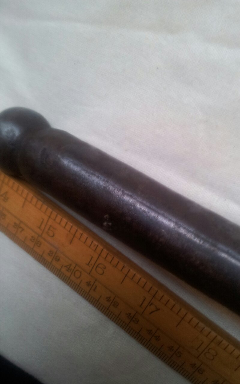 Weld lines on the haft mean that at least it isn't just a piece of modern pipe. I don't think almost 1kg is at all light for this kind of thing; my small Indo-Persian axes (mostly modern repros, but one might be a (newish) old one) vary from just under 550g to just over 650g. But you are the one who has had it in hand, and can judge how heavy you think it should be from the size. If it's much lighter than you think, is it possible that the head is hollow? (These things can be measured, and easily enough, though at the cost of wetting it.) |