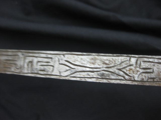 I'm posting better pictures of the inscribings (don't know what to call them) on the top wide part of the blade. Its long so its hard to get in one photograph. and reposting full blade for context. too crude for a decoration. Any thoughts? |