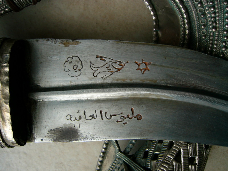 Have just received this Jambiya. Silver quality is not high, but not low either. About middle of the road as these things go. The blade inscription is NOT scratched on like so many we see, and is tidily inlet, as is the fish and other decoration. Not sure if I have the writing up the right way but if someone can translate it would be much appreciated.