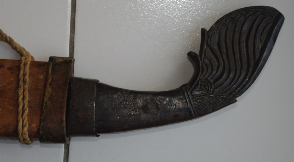 I'm not sure of the origin of this parang. I saw some parang on internet with a similare handle and identified as possibly Javanese. The blade is more stubby (massive?) than the javanese parang I've seen on internet. This parang is "rustic", the sheath is made of wood and copper alloy. Length of blade : 49cm Thank you for your help (and excuse me for my english level). |