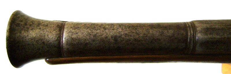 The buttplate is a plain piece of steel that goes about three centimeters down the back of the buttstock. The caliber is .75 and the bore is smooth, there is no rear sight.