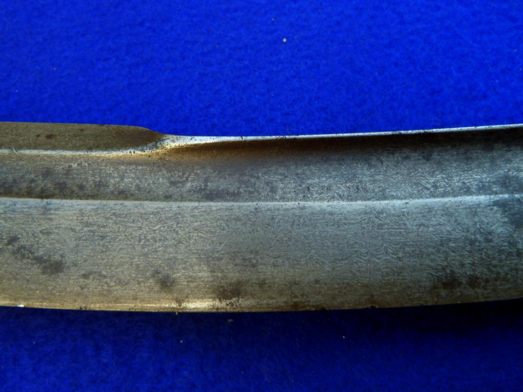 This beautiful indo-persian saber was recently sol. There sems to be a marked difference of opinion on the technique: is it a true mechanical damascus or just a superficial damascening ( etching?) I am putting a bunch of close-up pics for you to express your opinion. The input from professional bladesmiths is especially welcoe. Thanks. |