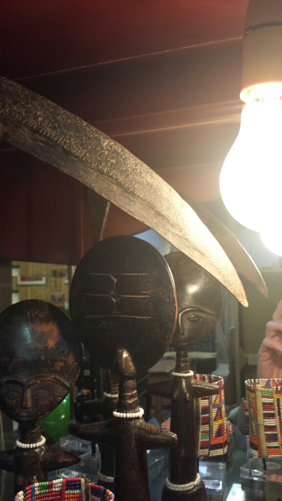 A few years ago I would say that this is not that kind of artefact which they used to copy "en mase" for tourists, like e.g. Aqua ba or Ibeji statuettes (both on your picture) or masks etc. Nevertheless, I found out that locals learn very quickly, that the local vendors are very responsive. E.g. if there are cca 3 "relatively rich foreigners" who collect cold weapons or another artefacts made of anything, in the capital for a few years (employees of foreign missions and organisations, companies), they usually ask for what they "need", giving descriptions, copying pictures from books etc to vendors. And vendors usually bring what they promisse from the bush and villages - either newly made/copied by local blacksmiths (the know how to "make it old", or really "old" (or letīs use eBay jargon - "tribally used"). Nowadays it is also complicated by using internet, some people gives them orders by e-mail. And so, very probably, they already have new iron stuff on stock in "antique shops", too. It is difficult to determine age from the picture, but I think "your item" is not new. Ihope I will not be mistaken if I say from thirties till seventies last century (?) Regards, Martin |