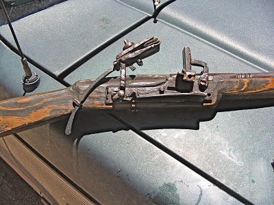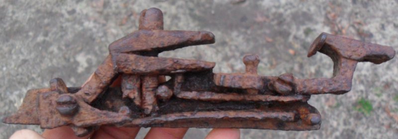 Unfortunately the Russian location of the find make it difficult to draw any conclusions . Below is an almost identical lock recently liberated from active service in Tibet. You can ignore the eccentric trigger release mechanism as this appears to be a local fix for defective sears on locks which are evidently much older. How much older is simply a guess. Stylistically you could argue that they are rustic variations on known seventeenth century Russian lock type or you could argue that these locks originated in the Mediterranean and were distributed through Portuguese trading . Their similarity to mediteranean toe locks ; Algerian , Iberian or Italian is difficult to ignore.